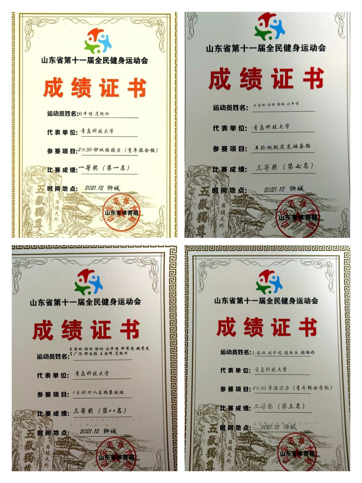近日,由山东省体育局、省教育厅等单位主办的山东省第十一届全民健身运动会跳绳比赛在山东聊城举办,法学院刘丰情、邢有情两名同学代表学校参赛,在跳绳项目中表现优异,取得佳绩。