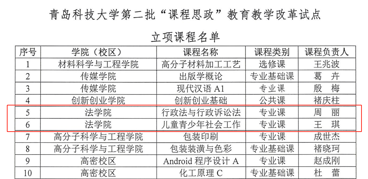 为全面推动我校“课程思政”教育教学改革,教务处于2019年11月启动了第二批“课程思政”教育教学改革试点课程校级立项申报工作。根据《关于开展青岛科技大学第二批“课程思政教育教学改革试点课程申报工作的通知》要求,经个人申报、学院推荐、教务处审定,确定32 门课程作为第二批校级“课程思政”教育教学改革试点立项课程。我院2门课程入校。