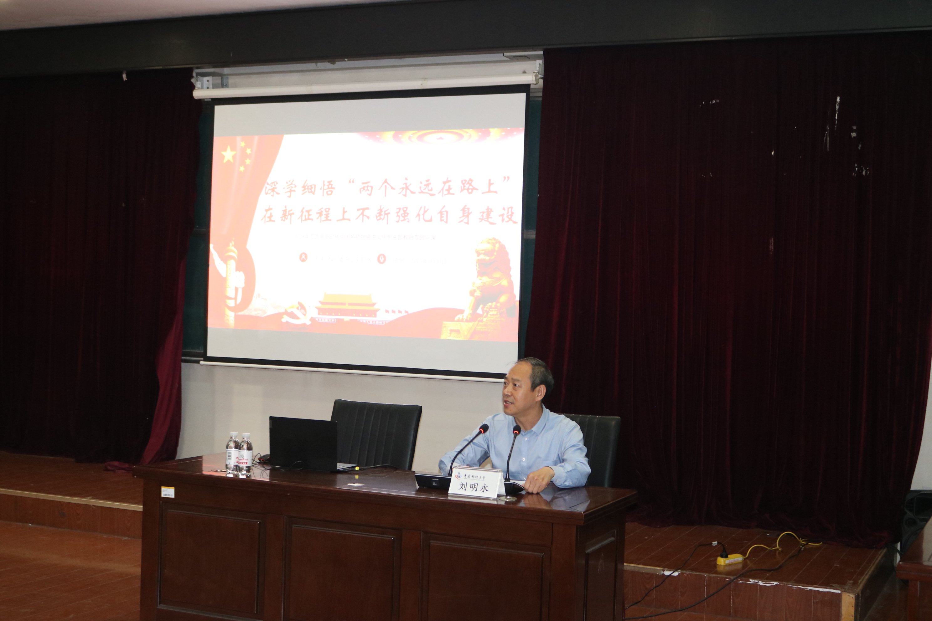 为进一步推进主题教育走深走实,确保全面从严治党向纵深延伸,6月13日下午,学校党委常委、纪委书记刘明永在弘毅楼A201以“深学细悟‘两个永远在路上’,在新征程上不断强化自身建设”为题,为法学院、传媒学院学生党员、入党积极分子上了一堂生动又有意义的党课。